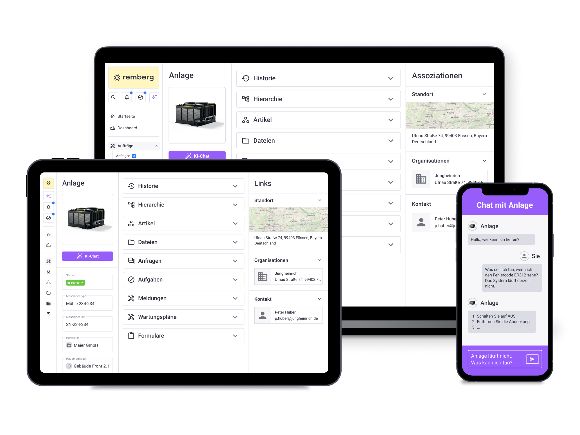Mit remberg verknüpfst du deine Instandhaltung intelligent mit bestehenden Systemen wie SAP, proALPHA oder Navision – ganz ohne doppelte Datenpflege oder Medienbrüche. Ob Stammdaten, Auftragsstatus oder Ersatzteilbestände: alles bleibt synchron, konsistent und zentral steuerbar.