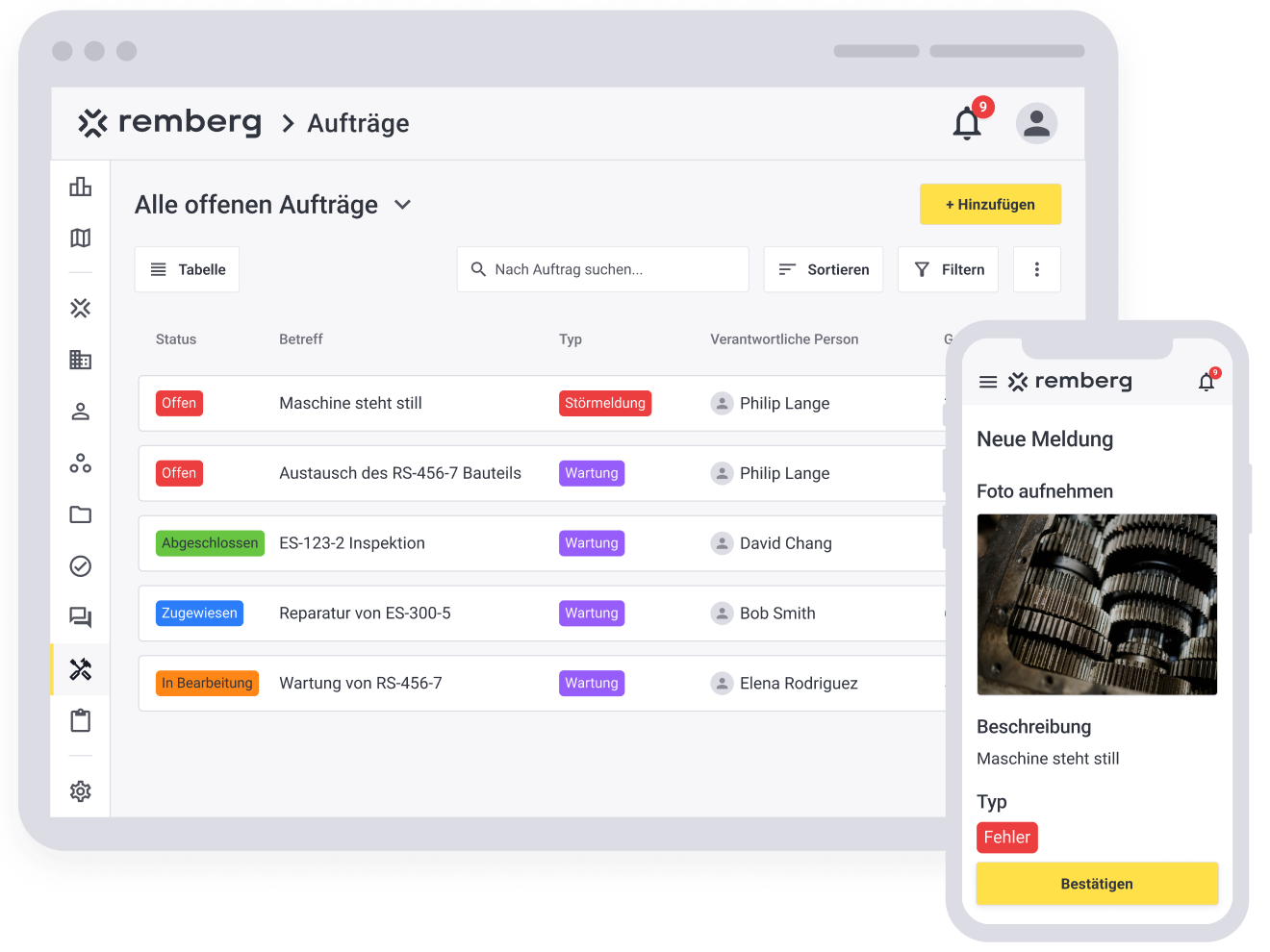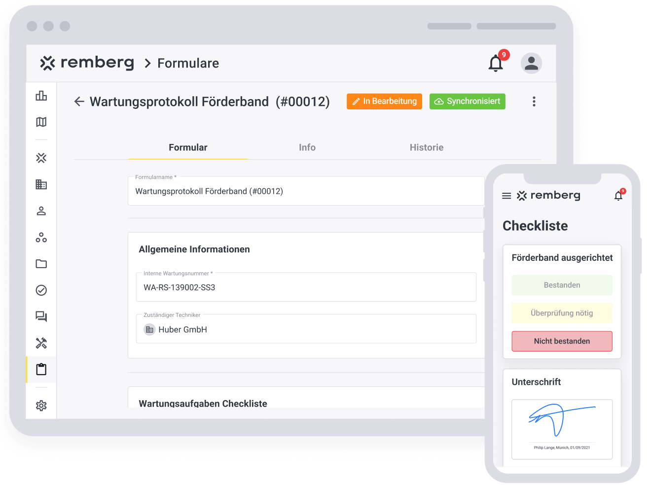 Ob Betriebsbegehung, Wartung oder Inspektion - mit remberg kannst du den Zustand vor und nach der Wartung dokumentieren, Schäden fotografieren und dem richtigen Arbeitsauftrag zuordnen. So erreichst du eine vollständige Transparenz und sicherst Nachverfolgbarkeit über alle Maßnahmen und Tätigkeiten.