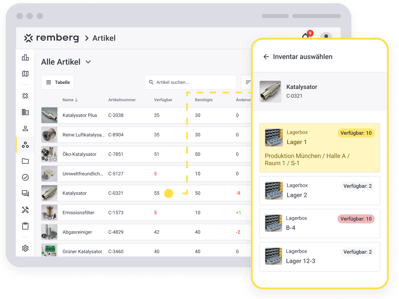 Mit der remberg Instandhaltungssoftware und mobilen App siehst du direkt an der Maschine, welche Ersatzteile verfügbar sind, prüfst Lagerbestände und kannst Bestellungen auslösen. Dabei ist direkt alles synchronisiert mit deinem ERP-System.