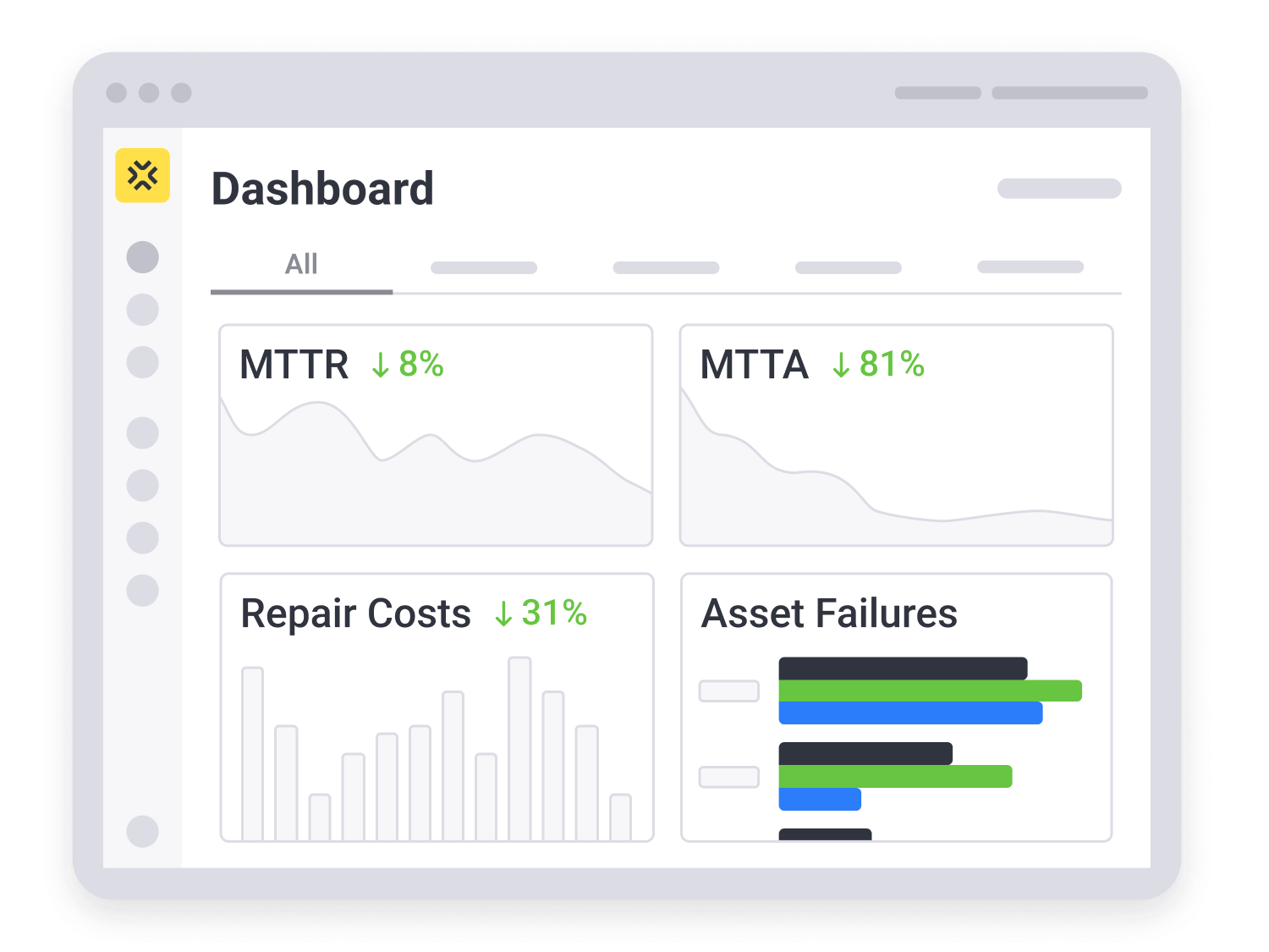 Monitor reliability, workload, and performance indicators by asset, type, and location in dashboard views.