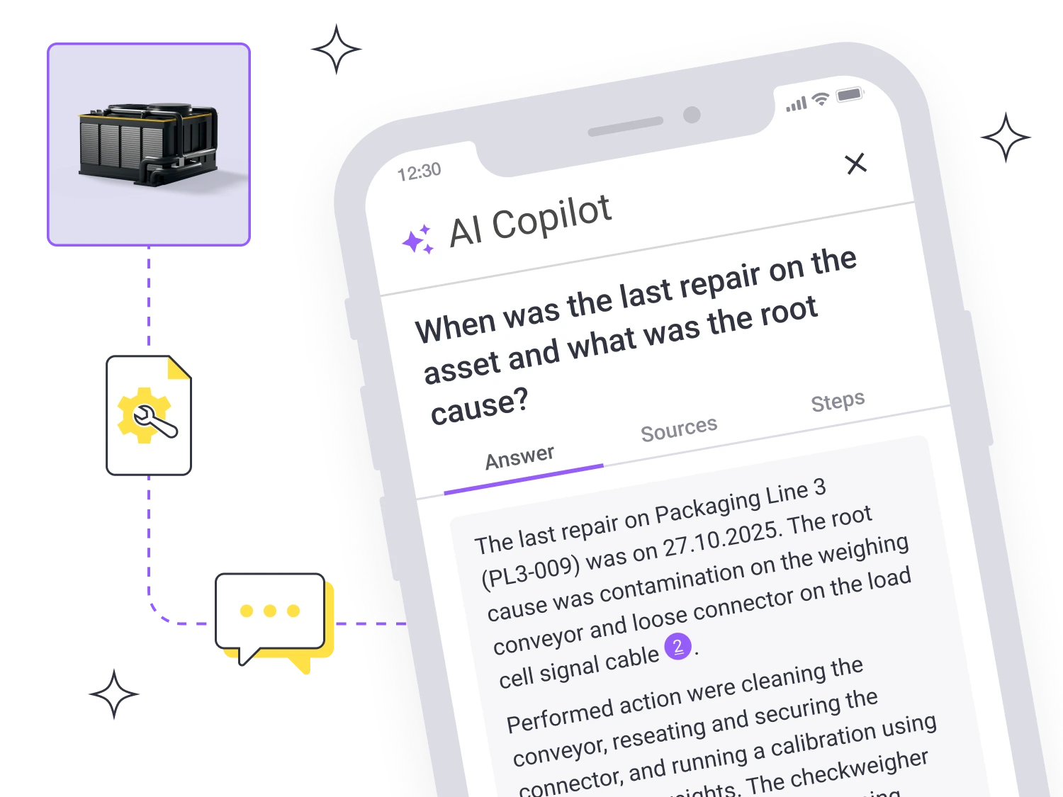 Organise assets in categories and hierarchies by site, line, and station, then link manuals, procedures, and failure history to each record.
